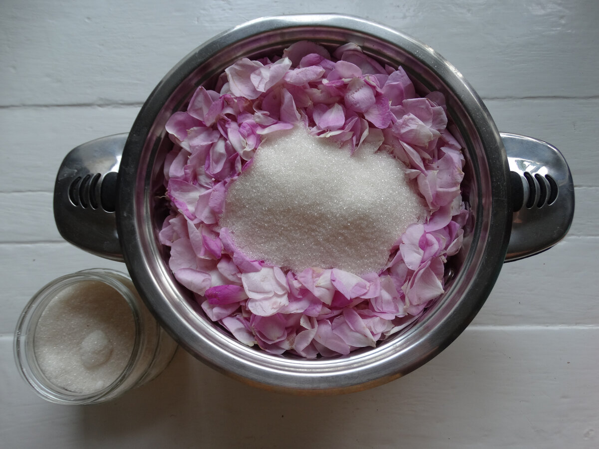 Чтобы варенье из розы получилось сногсшибательно вкусным, понадобится всего 2 продукта: лепестки чайной розы и сахар. А вот тонкостей и нюансов в этом рецепте огромное количество. И от них зависит, будет ли варенье сладким или с неприятной горчинкой. Сразу хочу заметить, что такое варенье можно приготовить разными способами. Первый, более популярный – лепестки розы заливаются сладким сиропом. Некоторые рецепты говорят, что розу в сиропе нужно довести до кипения. В других же сказано, что кипятить не нужно, хватит и того, что сироп горячий. О втором рецепте я более подробно расскажу и покажу в рецепте. Именно по нему я чаще всего и готовлю варенье. Я заранее подготавливаю лепестки. Очищаю и мою их. После чего даю лепесткам подсохнуть и засыпаю в кастрюлю с розой сахар. Останется только периодически помешивать лепестки с сахаром в течении нескольких часов. На следующий день в кастрюле появляется сироп. Можно начинать варить варенье. В этом рецепте я показала, не только, как приготовить ва