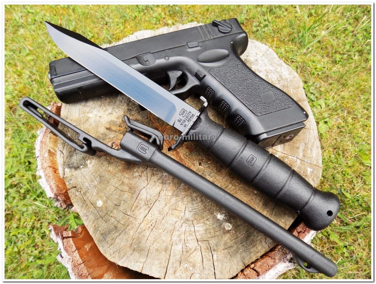 Всем привет, любители огнестрельных палок! Сегодня речь пойдёт не о оружии и не о экипировке. В этой небольшой статье я расскажу о таком же небольшом ноже от компании «Glock». Передам приветик моему подписчику с ником Гастон Глок! «Всё в нашем мире есть Глок!» А теперь посмотрим на сам ножичек. В начале 80-х годов в армию Австралии, на вооружение пехоты, спецов из «Kobra», поступил нож модель 81, выпускаемый хорошо известной фирмой «Glock».Размеры клинка у ножа равны 165 мм, а выполнен в стиле Боуи. Изготовлен из высокоуглеродистой нержавеющей стали 1095, твердость стали достигает 50-55 единиц по таблице Роквелла. Клинок покрыт чёрной, защитной краской. Обух имеет скос в стиле «щучка». Имеет одностороннюю заточку. Клинок данного вида идеально подходит для резки различных видов материалов, а вот пользоваться им в стиле рубящих ударов абсолютно нерационально, потому что длина и масса у него слишком мала. На обухе клинка сделана нарезка в виде пилы, что позволяет пользоваться ножом не то