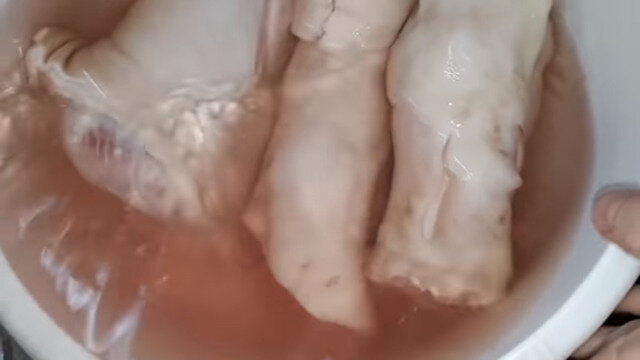 Красивый, вкусный, наваристый холодец, просто идеален для праздничного стола. Куриные бедрышки сделают бульон очень нежным. Обратите внимание на интересный вариант оформления. Ингредиенты: Способ приготовления: И как всегда холодец у нас начинается с подготовки мяса, хорошенько промываем и тщательно скоблим рульку и ноги, иначе блюдо не получится прозрачным. вымачиваем в холодной воде. Время вымачивание варьируется по разному от 2 до 8 часов. Желательно воду переодически менять, примерно раза 3-4, чтобы сошла вся кровь. Крупную рульку можете разделить на несколько частей. Подготовленное мясо заливаем водой и доводим до кипения. Первый бульон нужно слить и промыть мясо и кастрюлю. Снова заливаем ингредиенты холодной водой, чтобы она покрыла мясо и снова доводим до кипения на большом огне. Как только увидите, что начинается кипения убирайте огонь на минимум, иначе бульон будет мутным. Убираем пену и варим в течение 3,5 часов под крышкой на слабом огне. В процессе варки не доливайте воду!