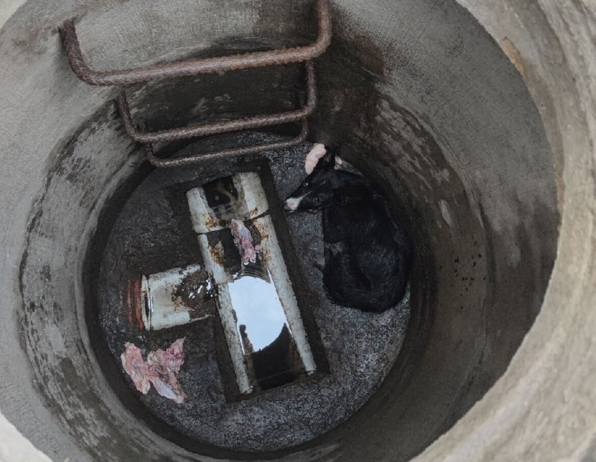 В общем иначе как очередным чудом не назвать то, что на газоне в стороне от дорожки кто-то из любопытства решил заглянуть в открытый люк. А там... обнаружился небольшой черненький собачий подросток, лежащий на приступке у дренажного канала на глубине трех метров.