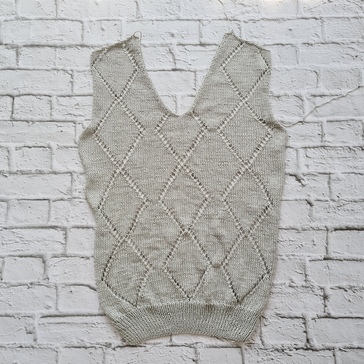 Переходим к вязанию переда. До пройм вяжем, как спинку: на спицы 3 мм набираем 95 петель, вяжем 20 рядов. Меняем спицы на 3,5, вяжем узором с ромбами 110 рядов. Для пройм закрываем по 3 петли в начале следующих двух рядов, затем сокращаем по 1-й петле в каждом 2-м ряду 3 раза.