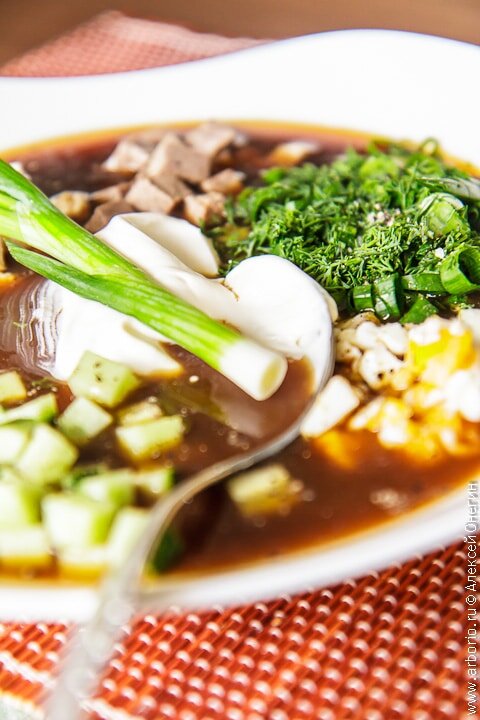 Окрошка — одно из гениальных блюд русской кухни, которое можно смело ставить в один ряд с такими холодными супами, как гаспачо, таратор или вишисуаз. Правда, найти хорошую окрошку бывает затруднительно — зачастую вместо бодрящего, пикантного, освежающего летнего кушанья этим словом называют непонятное месиво с докторской колбасой, залитое сладким квасом. Между тем, приготовить классическую русскую окрошку совсем несложно, зато в результате у вас получится самый настоящий деликатес! А то стыдно ведь — третье тысячелетие на дворе, а мы до сих пор оливье квасом заливаем, и хорошо ещё, если без майонеза. Рецепт классической окрошки на квасе Сложность средняя Время 15 минут Ингредиенты 4-6 порций 800 г мяса (варёной или печёной говядины, курицы, свинины, дичи, ветчины и т.п.) 4 яйца 4 свежих огурца большой пучок зелёного лука пучок укропа горчица хрен сметана соль чёрный перец 1 л белого кваса или кваса для окрошки Правильная окрошка начинается с правильного мяса. Первоначал