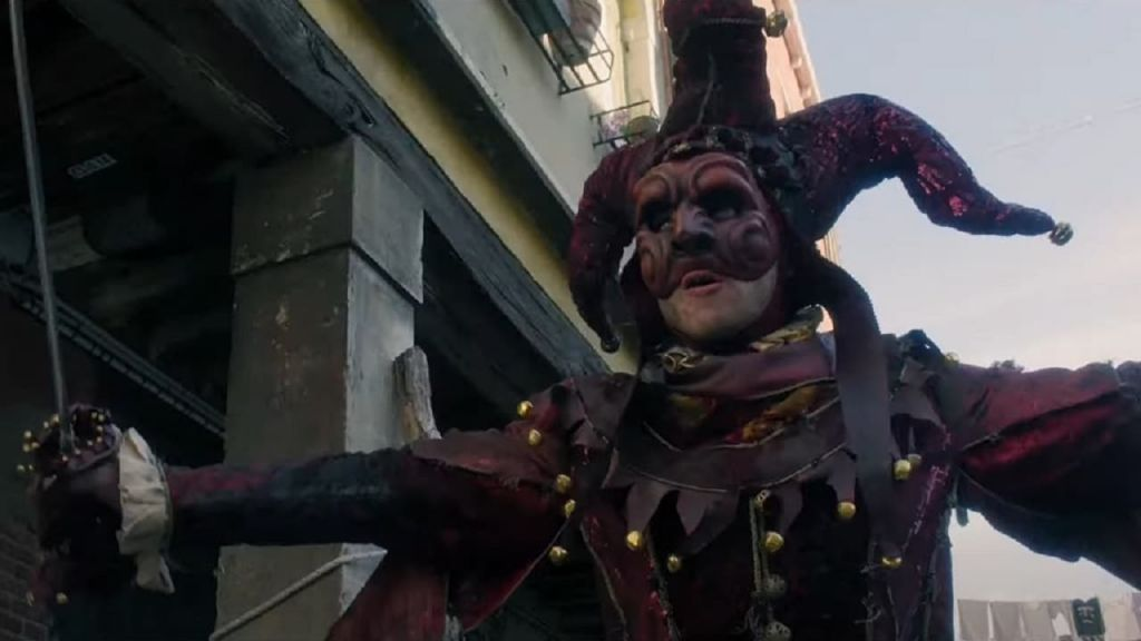 Если низводить «Венецияфрению» до конкретного жанра, то это, разумеется, будет джалло — криминальный триллер о таинственном убийце и его незадачливых жертвах. Душегуб в костюме шута бродит по округам, выискивает докучливых туристов и убивает их на глазах у других гостей города. А панику он пресекает мастерским обманом: злодей выставляет все как театральный перфоманс, эдакую сценку для туристов прямо на улицах Венеции. Зеваки, разумеется, верят и спешат снять кровавое действо на смартфон.