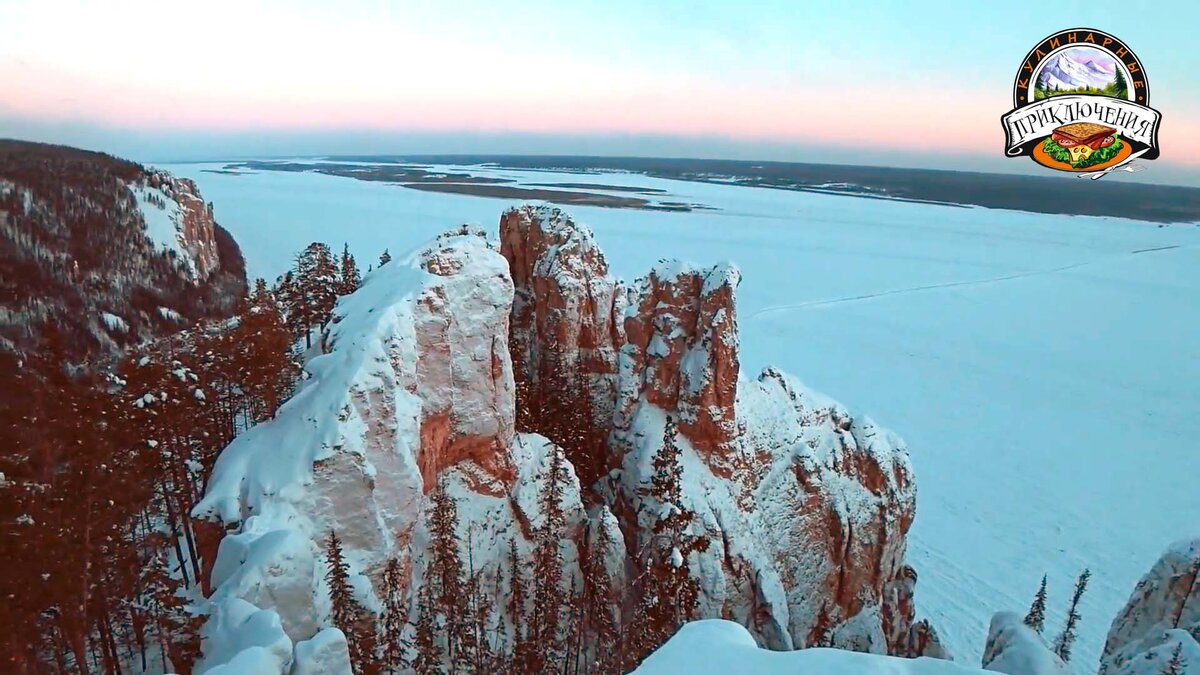 Солнце у самого горизонта, но вид все равно захватывающий – заснеженные столбы обрываются вертикально вниз и ровная снежная пустыня великой сибирской реки.