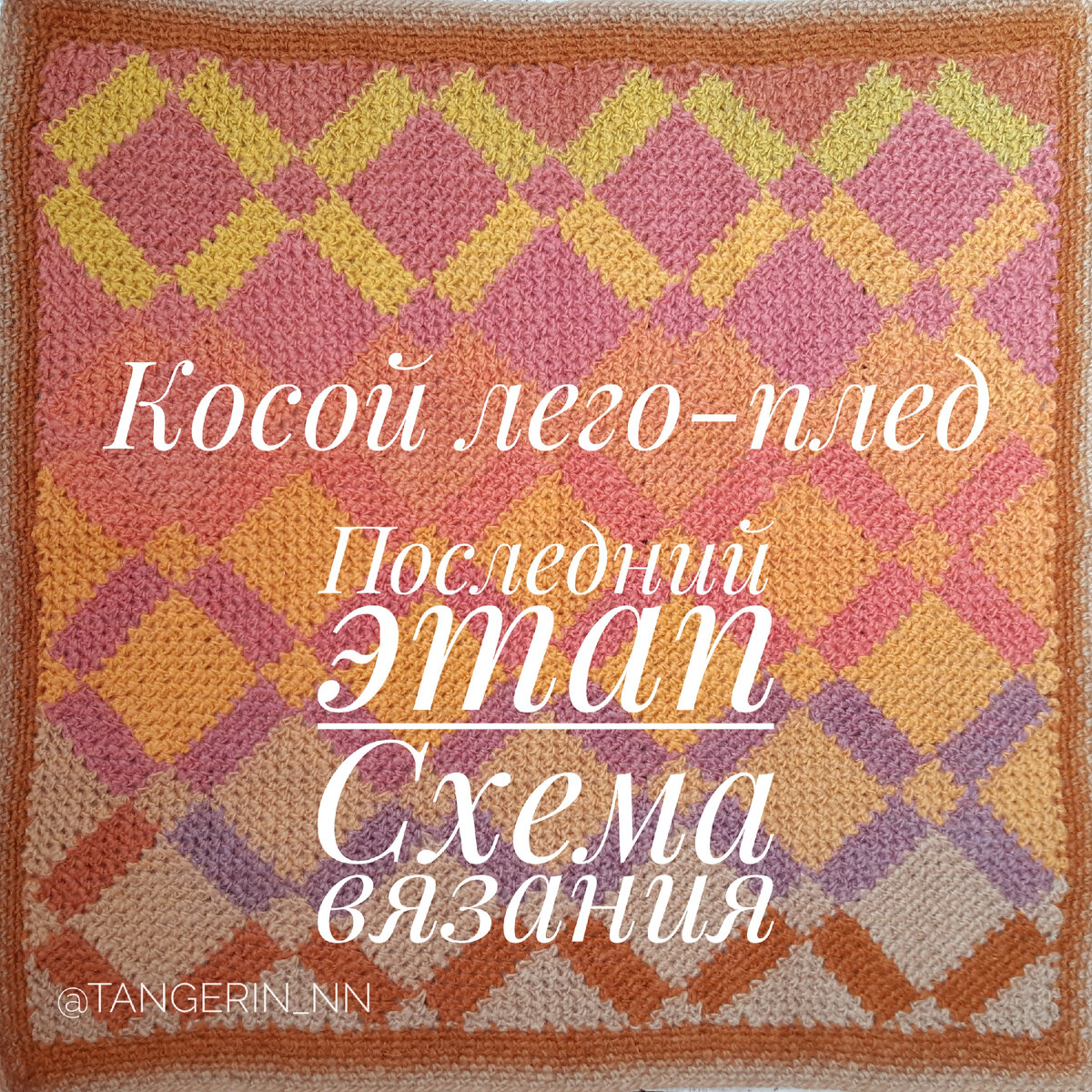 Надеюсь, ваши пледы заметно подросли с нашей последней встречи и приобрели форму, близкую к квадрату (или к прямоугольнику по вашему усмотрению). Теперь, чтобы сделать верхний край ровным, нам надо связать последний ярус, состоящий только из треугольников цвета 1. Смотрим на готовый плед, на котором последний ярус подсвечен поярче. А вот уже знакомая нам схема маленького пледа с обозначениями элементов каждого яруса. На ней последний ярус под номером 9, у вас последний ярус может быть и 13-ым, и 53-ым и каким угодно - все зависит от того, какого размера плед вы вяжете. И вот теперь мы готовы вязать последний ярус, выравнивающий верхний край. Смотрим схему вязания. В работе цвет цвет 1. Надеюсь, после того, как пройдены предыдущие этапы, эта схема вопросов и сложностей не вызовет. Кратко поясню - верхний ярус начинаем с левого углового треугольника (на схеме маленького пледа это 9Л), далее 9М и 9Б образуют раппорт, повторяем почти до конца яруса, заканчиваем 9М и правым угловым треуголь