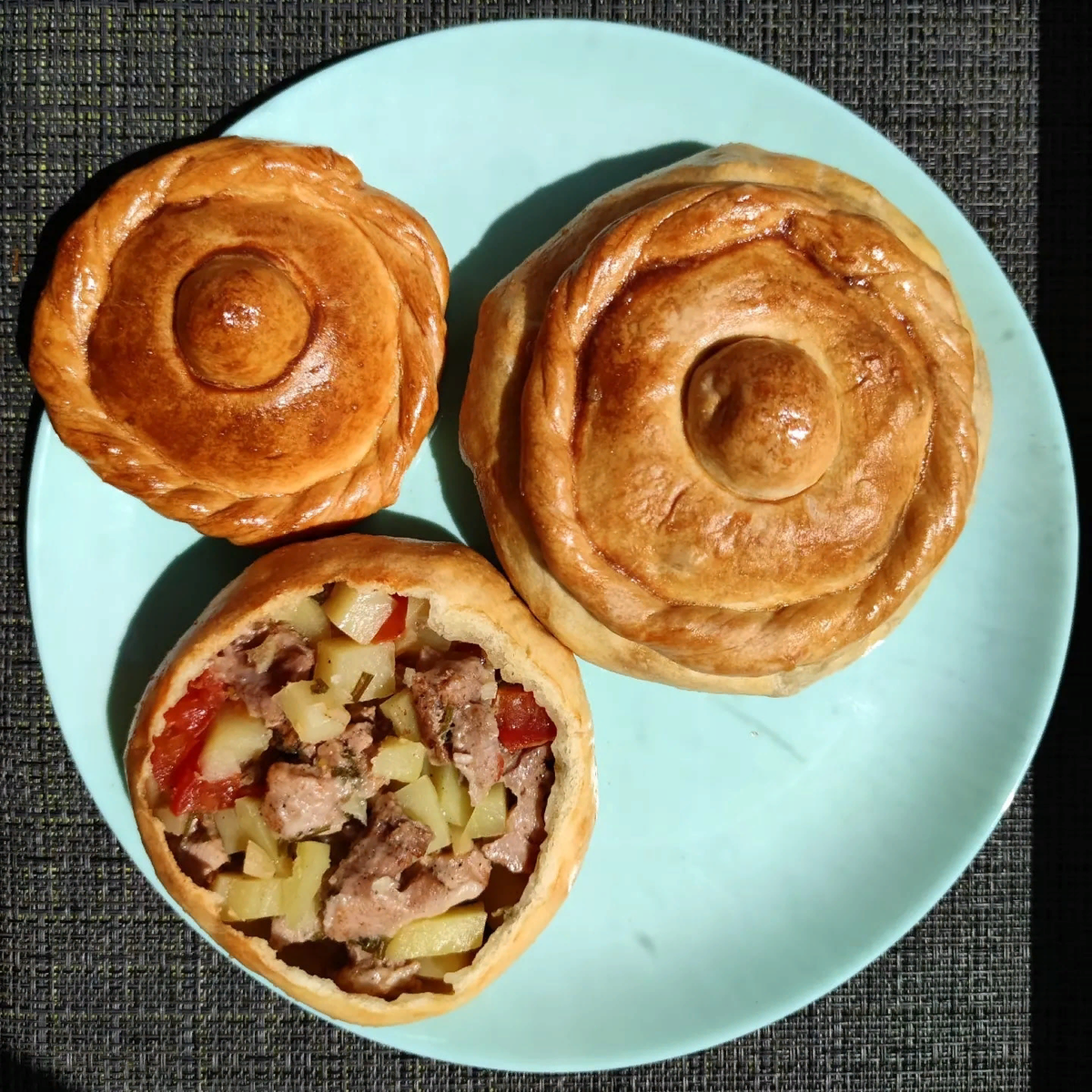 - Яйцо 1шт. для смазывания теста Приступим к приготовлению. Из указанных ингредиентов замешиваем достаточно тугое и эластичное тесто. Заворачиваем его в пищевую плёнку и кладём в холодильник на 30 минут. Для начинки: мелко нарезаем мясо, картофель, чеснок, лук, помидоры - всё перемешиваем и заправляем солью и приправами. Тесто делим на 4 равные части, от каждой отрезаем один небольшой кусочек. Большой раскатываем в круг 2-3 мм толщиной, перекладываем его в небольшую миску для удобства, затем начинка в центр, кусочек сливочного масла и собираем кулёк из теста, формируя шар. Каждый горшочек выкладываем вниз срезом на застеленный пергаментом противень. Из маленького куска теста делаем "ручку" на крышку и "ободок-косичку"
