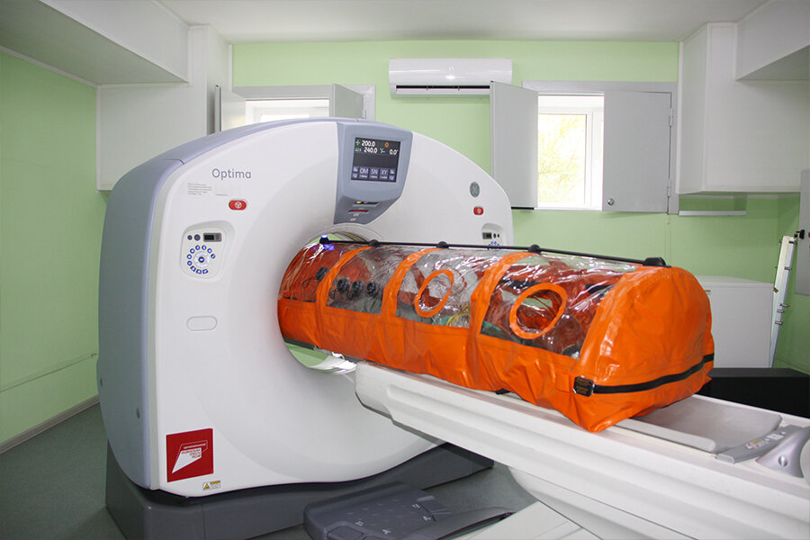 Переносной изолятор уже показал себя как эффективный продукт для безопасной транспортировки пациентов с подозрением на заражение особо опасными инфекциями (или пациентов с ослабленным иммунитетом) в стационарное медицинское учреждение. В этих целях бокс успешно применяется подразделениями здравоохранения России и зарубежья. Наши специалисты задались вопросом использования его не только для «внешних» транспортировок, но и для исключения риска распространения инфекции внутри больницы, например, при перемещении пациентов между отделениями для проведения обследования. В связи с пандемией COVID-19 особо остро встал вопрос проведения обследования на аппарате компьютерной томографии (КТ). Согласно существующему регламенту после каждого пациента с опасными заболеваниями (и подозрениями на них) требуется проведение процедуры дезинфекции аппарата КТ, а также проветривание помещения, в котором он расположен. Все эти действия блокируют работу кабинета КТ на продолжительное время. Ме