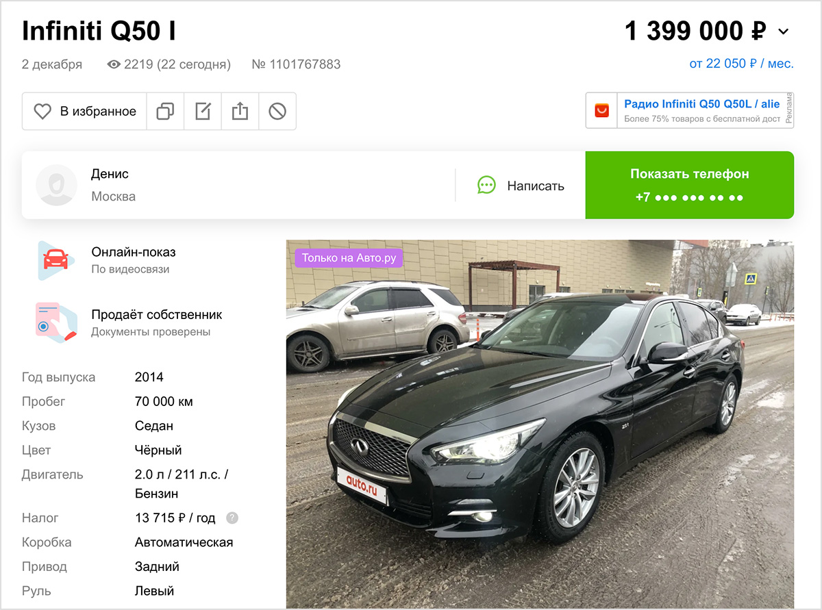 Судя по датам, это произошло после аварии в июле 2016 года, которая записана в ГИБДД как «наезд на стоящее транспортное средство». Однако на фото с аукциона Infiniti выглядит совсем целым. Но это потому, что снимали его только спереди. После аукциона Q50 продавался так же на Авто.ру — и бережно сохранённое нашим сервисом объявление позволяет узнать реальную картину.