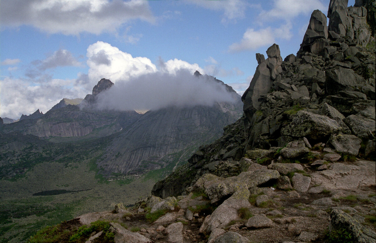 Далее в наших планах - озеро художников. Очень красивое, и вобщем-то труднодоступное место. Даже на конях к нему сложно пройти, только пешком. Но, по пути, тоже было на что посмотреть. Удивительные все-таки горы на Ергаках... Облако "зацепилось" за вершины )) К озеру Художников спускались по огромному курумнику, такая была "тропа", камни доходили размера роста и больше, и между некоторыми, и даже под ними можно было пройти, но мы не рисковали, и шли поверху. А чаще прыгали :) Прыгать приходилось через глубокие щели, не дай Бог упасть туда, выбраться было бы непросто. Напрыгавшись, к вечеру все-таки перед нами открылось озеро неимоверной красоты! И каменный островок с растущей на нем парочкой сосен :) Спустившись, мы почувствовали приличную усталость, поставили палатки, приготовили ужин, поужинали, и спать... Завтра пойдем знакомиться с окрестностями, и любоваться еще одной достопримечательностью - знаменитой параболой. Утро снова порадовало погодой, и мы, позавтракав, с удовольствием п