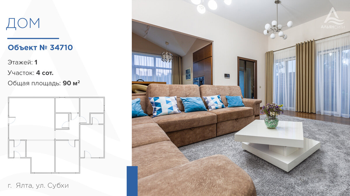 Объект № 34710 Продается жилой дом в городе Ялта. Площадь дома 90 кв.м. Площадь участка: 400 кв.м. Количество этажей: 1 Холл 3.9 кв.м., гостинная 27.2 кв.м., кухня 11.6 кв.м., кабинент-спальня 10.2 кв.м., коридор 5.9 кв.м., санузел 2.8 и 5 кв.м., тех.помещение 6.4 кв.м., гардеробная 1.9 кв.м., спальня 11.5 кв.м. - Продаётся со всей мебелью и бытовой техникой. - Локация: ближайшая остановка общественного транспорта и магазин в 500 метрах. До автовокзала 1.3 км., до центра города Ялта 3 км. - С участка открывается вид на город Ялта, море и горы. - На участке предусмотрена парковка на два автомобиля, бассейн с подогревом воды от газа и немецкой системой очистки воды. - В доме установлены новейшие энергосберегающие инверторные кондиционеры ELECTROLUX, серия Monaco. - Установлены автоматические ворота с дистанционным открыванием. - Коммуникации: водопровод, канализация, центральное электроснабжение. Дом введён в эксплуатацию в марте 2020 года. Собственник один Стоимость: 19 700 000 руб.