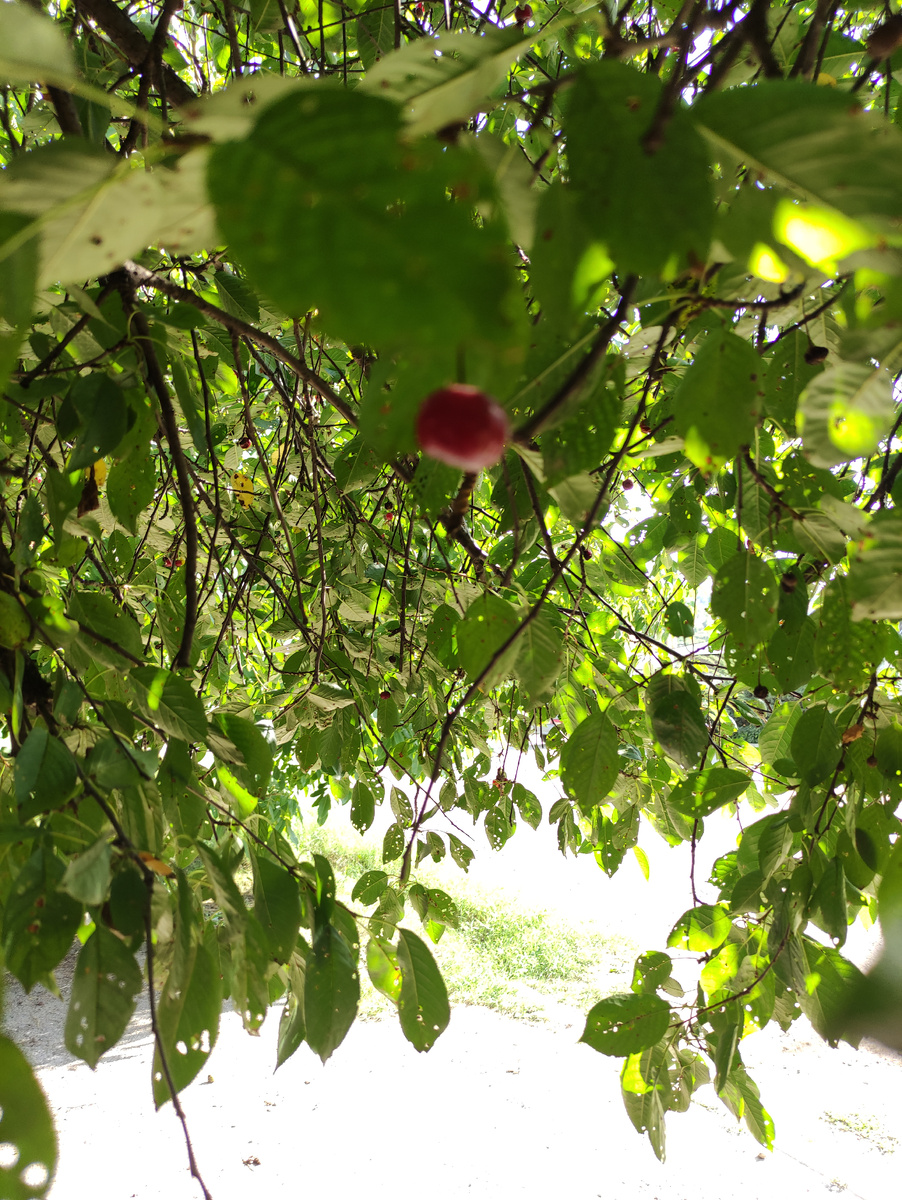 Хочется описывать простые дела, понимаете? Сбор вишни. "Вишня уходит," - говорит мама. Нижние ветки уже обобраны или осыпались. Теперь до ягод дотянешся только со стремянки. Стремянка покачивается, никак не установить её ровно на меже. На ступеньке между ног - ковшик, голова - в густой кроне. Это совершенно детское ощущение: кто лазил по деревьям, тот знает. Начинаешь искать вишнёвую смолу на стволе. В моем детстве застывших смоляных капель было много, мы её жевали, тягучую, горьковатую... Сейчас не нахожу. Зато солнечная нить продета через каждую вишнёвую бусину, сквозь каждый лист. Здесь, в листве, солнце не ощущается непосредственно, оно отфильтровано, процежено сквозь зелень, дозировано. Оно очерчивает контур каждого листа, наполняет густым внутренним светом каждую вишню, определяет для художников точное место светового блика на ягоде. От этого поднимается настроение. А может быть, радостно становится от того, что тянешься вверх и смотришь ввысь (говорят же, что взгляд выше уров