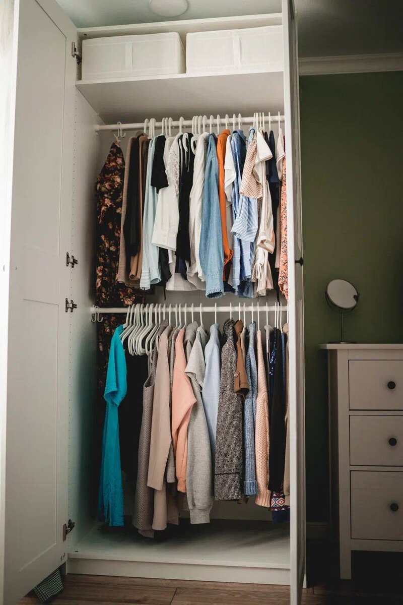 - развешивайте верхнюю одежду так, чтобы выдержать пространство между изделиями в 2-3 см. это обеспечит циркуляцию воздуха;