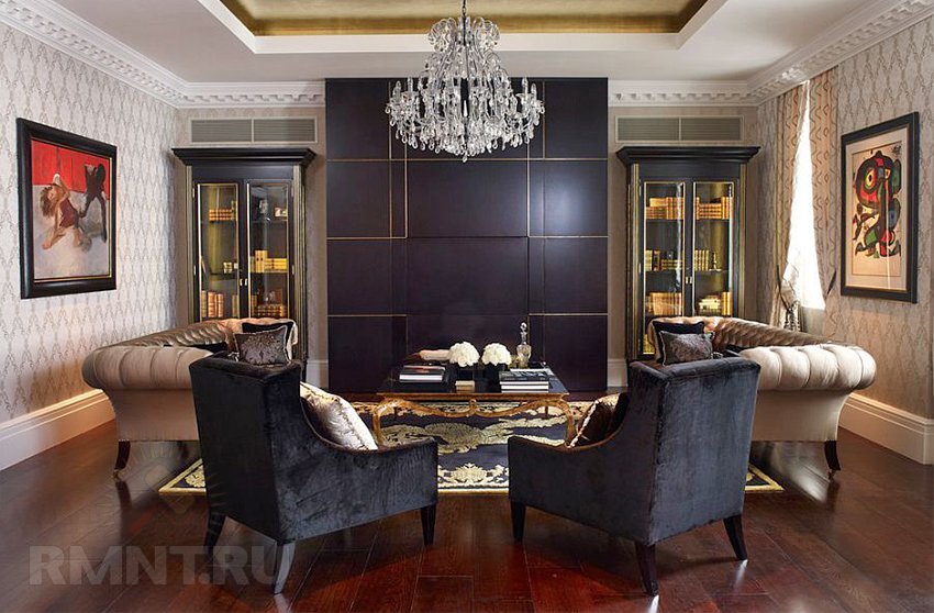 Например, в танцевальных студиях, некоторых офисах, кинозалах и ресторанах используют просто чёрный занавес или обивку под ткань, простое окрашивание грубых стен. В этом интерьере сразу на первое место выходит свет софитов, шикарная люстра, переливающаяся в лучах света, интерьерные рамы и зеркала.