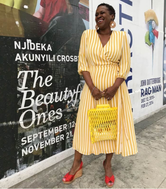 Джули (вверху) выглядит потрясающе в желтом полосатом платье с запахом.