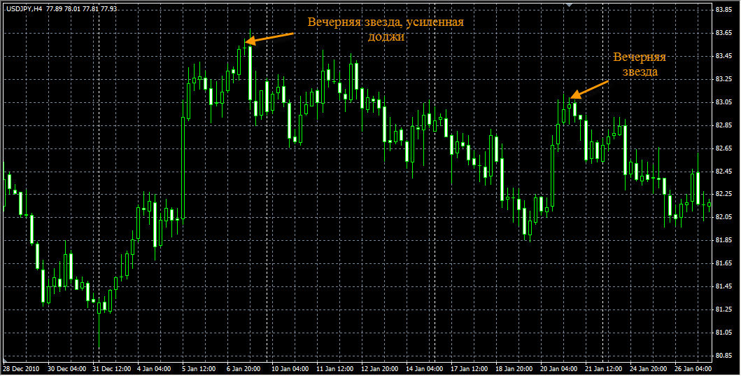 Одними из самых удивительных в свечном анализе являются модели разворота, в которые входит звезда. Так называется свеча с маленькими телом, возникающая после свечи с большим телом с образованием гэпа между телами. При этом не имеет значения, перекрывают ли друг друга тени свечей и какой у звезды цвет. Звезда появляется на вершине или в основании, в последнем случае ее иногда называют «капля дождя». Имеется особое название и у звезды, у которой почти отсутствует тело, — звезда дожи. Появление звезды, особенно звезды дожи, предупреждает о возможном завершении предыдущего тренда. Так, если на бычьем рынке звезда возникает после длинной белой свечи, значит силы быков и медведей достигли некоего равновесия за счет ослабления позиций первых или усиления позиций вторых. Если же звезда образуется на медвежьем рынке, значит энергия, толкавшая цены вниз, ослабела, и падение вряд ли продолжится. Звезды входят в состав четырех моделей разворота: 1. Вечерняя звезда. 2. Утренняя звезда. 3. Звезда