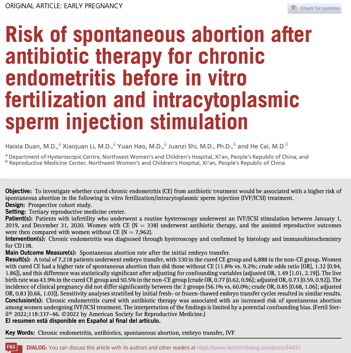 Публикация вышла под названием :Риск прерывания беременности после лечения антибиотиками хронического эндометрита перед проведением ЭКО. 2022 год Хронический эндометрит (ХЭ) - это слабое воспаление в эндометрии, которое диагностируется гистологически путем определения в строме эндометриодной ткани плазматических клеток. По некоторым исследованиям наличие хронического эндометрита связано с повышением риска бесплодия на 60%. Так же есть исследования, которые говорят о том, что у женщин с повторными неудачами имплантации в 14%–67.6% и у женщин с привычным невынашиванием беременности в 8.9%–56.0% случаев предполагая связь между эндометритом и плохими репродуктивными исходами. Хотя данные свидетельствуют об эффективности назначения антибиотиков для лечения ХЭ, влияние ХЭ и его лечения на репродуктивные исходы остается неоднозначным. Например есть исследования показывающие, что, несмотря на успешное лечение, пациентки с ХЭ по-прежнему имеют более низкие исходы беременности. Очень важно,