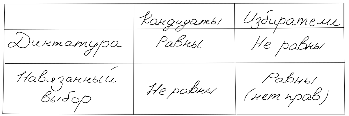 В такой системе уже не равны права кандидатов: у одного из них априори нет шансов на успех. Права избирателей, напротив, равны, но равны в своём бесправии. Тоже не очень справедливо, не так ли?