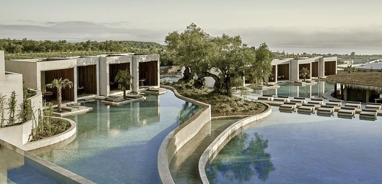 Великолепный с архитектурной и эстетической точки зрения отель Olea All Suite оформлен в потрясающем стиле, который гармонично сочетается с окружающей средой. Нетронутая красота встречается с возвышенной роскошью. Органично расположенный среди оливковых рощ на зеленом склоне холма великолепного греческого острова Закинф, отель Olea All Suite Hotel обрамляет природную красоту этой жемчужины Ионического моря во всем ее великолепии. Здесь вы найдете по-настоящему расслабленный подход к жизни, ведь Olea All Suite Hotel — это современное тихое место для отдыха. Курорт с передовым дизайном способствует наслаждению комфортом сдержанной роскоши в обстановке, наполненной современной чувственностью и шиком. Олеа был задуман как нетронутая, уединенная гавань, где успокаивающая сила воды играет ключевую роль в планировке курорта, способствуя гармоничному диалогу с окружающей природой. В центре курорта, подобно ослепительному оазису, находится огромный бассейн произвольной формы, который
