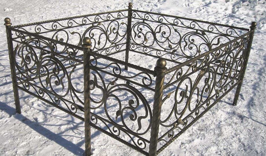 Сегодня оградки на могилу с коваными элементами очень популярны, и отлично позволяют благоустроить захоронение. Такие металлические ограждения изготовляют с различными фигурами в виде узоров, цветов, веток, плодов. Благодаря оградке могила защищена от бродячих и диких животных, а также позволяет сохранить ландшафт вокруг могилы. Раньше такие оградки были очень дорогими, но современное производство вышло на новый уровень. И уже в наше время можно приобрести их по доступной цене. Оградки с элементами художественной ковки имеют массу преимуществ. Территория захоронения выглядит более привлекательной и ухоженной. Кованые оградки достаточно долговечны и не подвержены влиянию атмосферных осадков и резким изменениям температуры. Также на фоне гранитного или мраморного памятника металлические изделия смотрятся очень достойно. К тому же оградка устанавливает четкие границы всего захоронения. Для изготовления оградки применяют профильную трубу с добавлением кованых элементов. Благодаря качествен