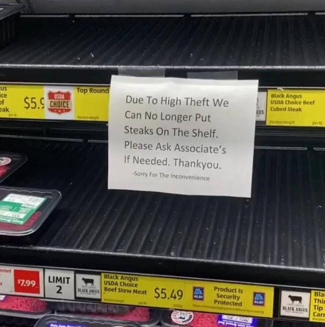 1. Объявление на полке супермаркета в США: «из-за высокого уровня воровства мы больше не выкладываем стейки на полки. Пожалуйста, обращайтесь к сотрудникам магазина. Спасибо» (ссылка):