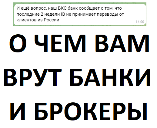 Банки и брокеры врут клиентам из России, пытаясь их хоть как-то удержать у себя. Врут нагло и в открытую, не пытаясь даже создать иллюзию правдоподобности. Например, врут о том, что: 1) Interactive Brokers не принимает переводы из России - я сам на прошлой неделе переводил валюту из Райффайзена, а клиенты успешно пополняли счета и неделю, и две, и четыре назад. 2) Запрещены валютные переводы за рубеж, особенно в "недружественные" США - переводы разрешены, если вы не превышаете лимит в 1 000 000$ в месяц. 3) Акции иностранных "вражеских" компаний вообще нельзя покупать - ложь, которая тянется неизвестно откуда. Да, некоторое время назад не было уверенности, что можно ПРОДАВАТЬ акции на зарубежном счете, но это разрешение уже давно дали. А запрета на покупку никогда не было. Поздравляем вас, господа, соврамши! Да, иногда это не ложь, а заблуждение техподдержки. Поэтому не стоит обращаться ни в отделения банков, ни в техподдержку без излишней необходимости - а просто делать свои пе