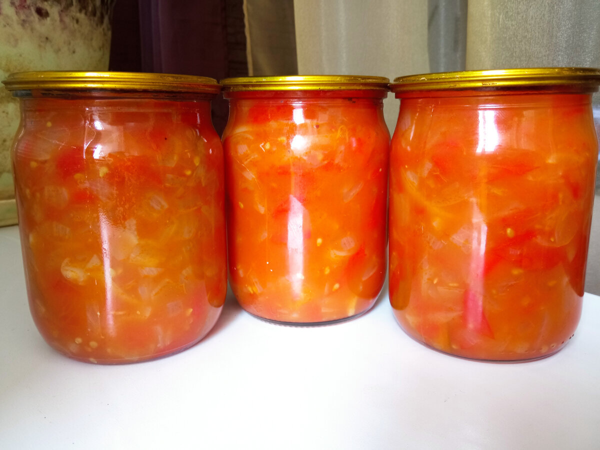 Количество ингредиентов рассчитано на 3 банки по 0,5 л. Помидоры - 1 кг. Лук - 300 гр. Перец болгарский - 3 шт. Масло растительное - 30 мл. Соль - 1 ч.л. Сахар - 2 ст.л. Уксус 9% - 1 ст.л. ПРИГОТОВЛЕНИЕ: Банки предварительно промываю и стерилизую в микроволновке с небольшим количеством воды 10 минут Крышки кипячу пару минут Лук 300 гр. нарезаю кубиками Перец болгарский 3 шт. нарезаю соломкой (или как больше нравится вам) На сковороду вливаю небольшое количество растительного масла Обжариваю лук до полупрозрачности Помидоры 1 кг. нареза