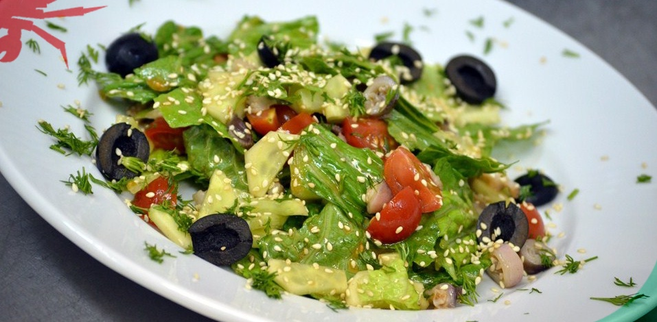 Ингредиенты: В течение 15 минут отвариваем осьминогов. Затем сливаем воду, даём им остыть и нарезаем их небольшими кусочками. Берём миску, выдавливаем в неё сок лимона и лайма. Добавляем соевый соус, оливковое масло и кимчи. Хорошенько перемешиваем. Мелко нарезаем укроп. Салатные листья рвём руками. Полукольцами нарезаем огурцы. Черри разрезаем на 3 части. Оливки разрезаем пополам. Разогреваем сковороду и в течении 1 минуты обжариваем осьминогов. Затем добавляем устричный соус и готовим ещё 1 минуту. Смешиваем в миске осьминоги, огурцы, листья салата, помидоры. Заправляем приготовленной заправкой. Посыпаем кунжутом, укропом и оливками. Блюдо готово. Приятного аппетита! Источник: https://wildcrab.ru/news?id=1650