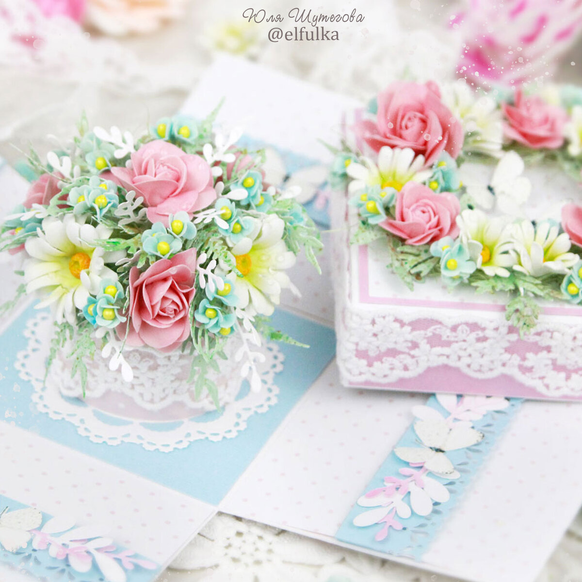 Доброго времени суток! Представляю вашему вниманию открытку ручной работы в виде коробочки (с сюрпризом) - это очень интересный и необычный вариант поздравительной открытки. Размер этой коробочки 9х9х9см Коробочка-открытка выполнена в нежной цветовой гамме: белый, розовый, голубой с добавлением нежно-зеленого цвета. Основа коробочки выполнена из дизайнерского картона и оформлена скрап-бумагой с цветочным рисунком. Крышечка украшена цветочной композицией из цветиков ручной работы (ромашки, розы, незабудки), ажурными веточками, листиками, бабочками. На бортиках розовый кардсток и изящное кружево белого цвета. Внутри коробочки-открытки прячется пышный букет из вечно цветущих роз, ромашек, незабудок. Все цветки выполнены из фоамирана. Каждая деталька цветочков вырезалась и тонировалась вручную. А на стеночках размещены ажурные ленты-держатели, куда помещаются денежные купюры или личные записки. Ленты украшены вырубными элементами и картинками бабочек. Для тех, кто любит видео формат, на