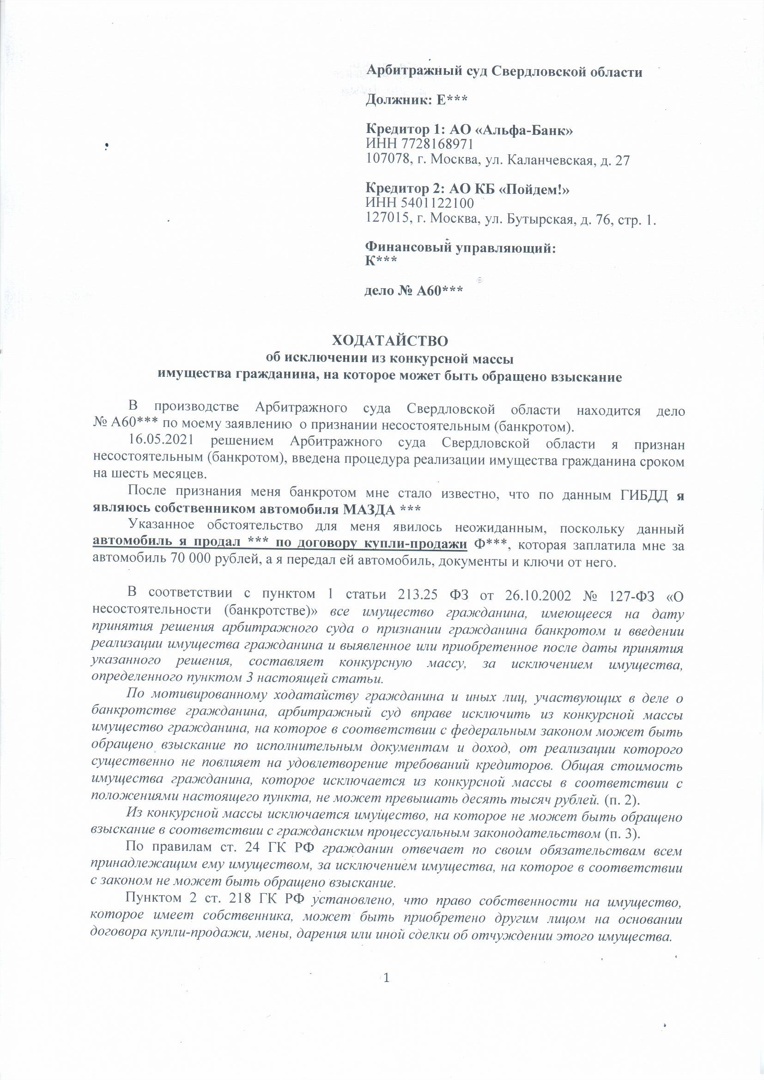 Вот уже более 6 лет мы занимаемся банкротством физических дел. Все процедуры у нас проведены успешно, около 100 человек признаны банкротами, освобождены от долгов и начали новую жизнь с чистого листа. Но иногда в процедуре банкротства возникают нестандартные ситуации. Как, например, с этим Клиентом. Человек в 2018 г. продал свой автомобиль и забыл о нем. Начав процедуру банкротства, выяснилось, что проданный автомобиль до сих пор по данным ГИБДД числится за человеком. Клиент в шоке…. Что делать? Как же быть? Ведь во время банкротства все имущество граждан, за исключением единственного жилья, подлежит продаже с торгов… Мы успокоили нашего Клиента, ведь безвыходных ситуаций не бывает. Сейчас нами подготовлено и направлено в суд ходатайство об исключении этого автомобиля из конкурсной массы. Ждем назначения судебного заседания!!!! В суде мы должны доказать, что наш Клиент действительно продал автомобиль и не скрывает его от кредиторов.