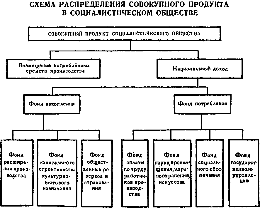 Как уже говорилось, совокупный общественный продукт за вычетом части, идущей на возмещение потреблённых средств производства, образует национальный доход социалистического общества. Национальный доход распадается на два больших фонда: фонд накопления, за счёт которого осуществляется непрерывный рост и совершенствование социалистического производства, и фонд потребления, за счёт которого обеспечивается удовлетворение постоянно растущих материальных и культурных потребностей всего общества.