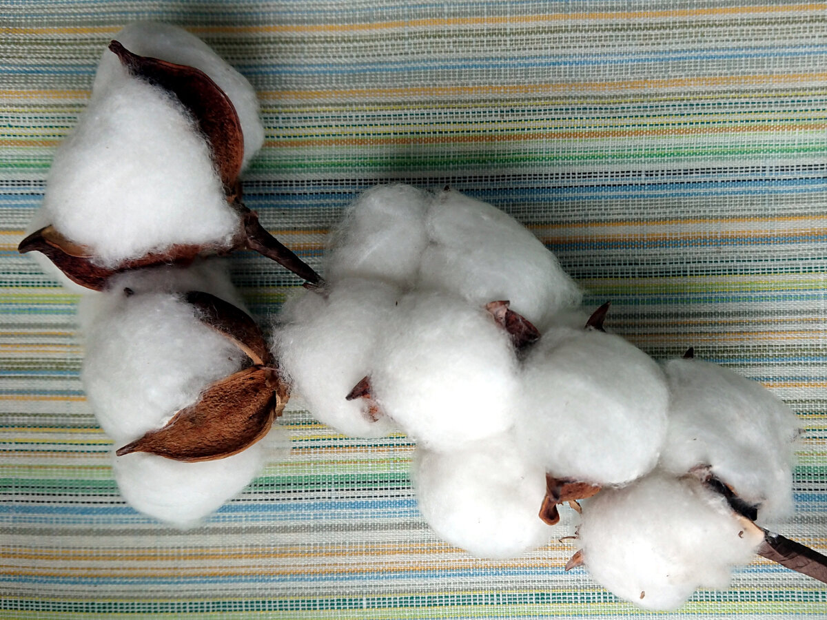 Желание детально рассмотреть натуральные волокна хлопка толкнуло меня на покупку декоративной ветки «Хлопок». Невооруженным глазом видно, что стебли — проволока, обёрнутая бумагой, но меня подкупило то, что коробочка настоящая. Она и в самом деле настоящая. Клетки снаружи хорошо видны уже при увеличении ×400. При чуть меньшем увеличении больше похоже на грецкий орех. Внутренняя поверхность коробочки. Клеточная структура как у древесины. Хлопковые волокна приклеены к коробочке клеем. Это говорит нам о том, что перед нами четыре кусочка ваты. В составе явно указаны хлопок и полиэстер. Волокна, увеличенные в 200 раз. Неожиданным образом они показали себя в тёмном поле. При том же увеличении, но подсвеченные снизу под углом, волокна теряют свою яркость, проявляя зернистость. Действительно, увеличение ×750 показывает, что на поверхности волокон есть мелкие частицы. Увеличение более 1000. Однако, среди пучка волокон есть и и абсолютно гладкие. Вероятно, в этом и есть отличие между натуральн