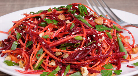 Для салатов можно использовать сырую или вареную свеклу. Если хотите сохранить в ней максимальное количество полезных веществ и витаминов, замените варку запеканием в фольге. Для этого вымойте корнеплоды, оберните фольгой и уложите на противень. Время запекания определяется размером овоща, для небольшой свеклы потребуется 40-45 минут. Для заправки используют растительное масло или сметану. Свекольно-морковный салат с чесноком и орехами Надо: 130 г свеклы;