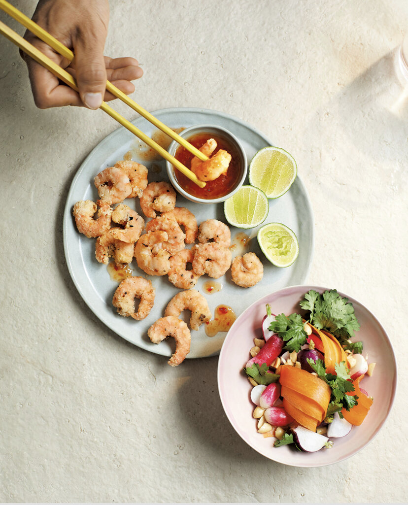 Подавайте с салатом из моркови, редиса и кинзы, сладким соусом чили
