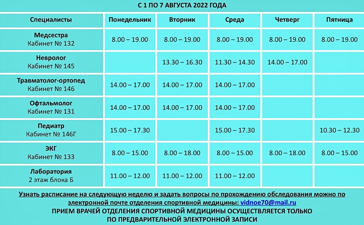 Сегодня мы публикуем график работы отделения на следующую неделю и уточняем порядок записи на прием к врачам и порядок обследований. ☝️Важно! Прием врачей отделения спортивной медицины проводиться по электронной записи. Вы можете записаться на портале «Госуслуги» к следующим врачам-специалистам отделения спортивной медицины: неврологу, травматологу-ортопеду, офтальмологу. На прием к врачам необходимо приходить с картой спортсмена, которую вы получаете в кабинете № 132. К врачу-педиатру отделения спортивной медицины - можно записаться только после осмотра всех врачей и имея на руках электрокардиограмму с расшифровкой, а также результаты лабораторных исследований (общий анализ крови и общий анализ мочи). Для тех, кто не имеет прикрепления к городским поликлиникам и не может самостоятельно записаться на прием к специалистам, необходимо обратиться в 132 кабинет, при себе иметь полис ОМС, свидетельство о рождении или паспорт. В кабинете № 132 с 8.00 до 19.00 в рабочие дни медицинская се