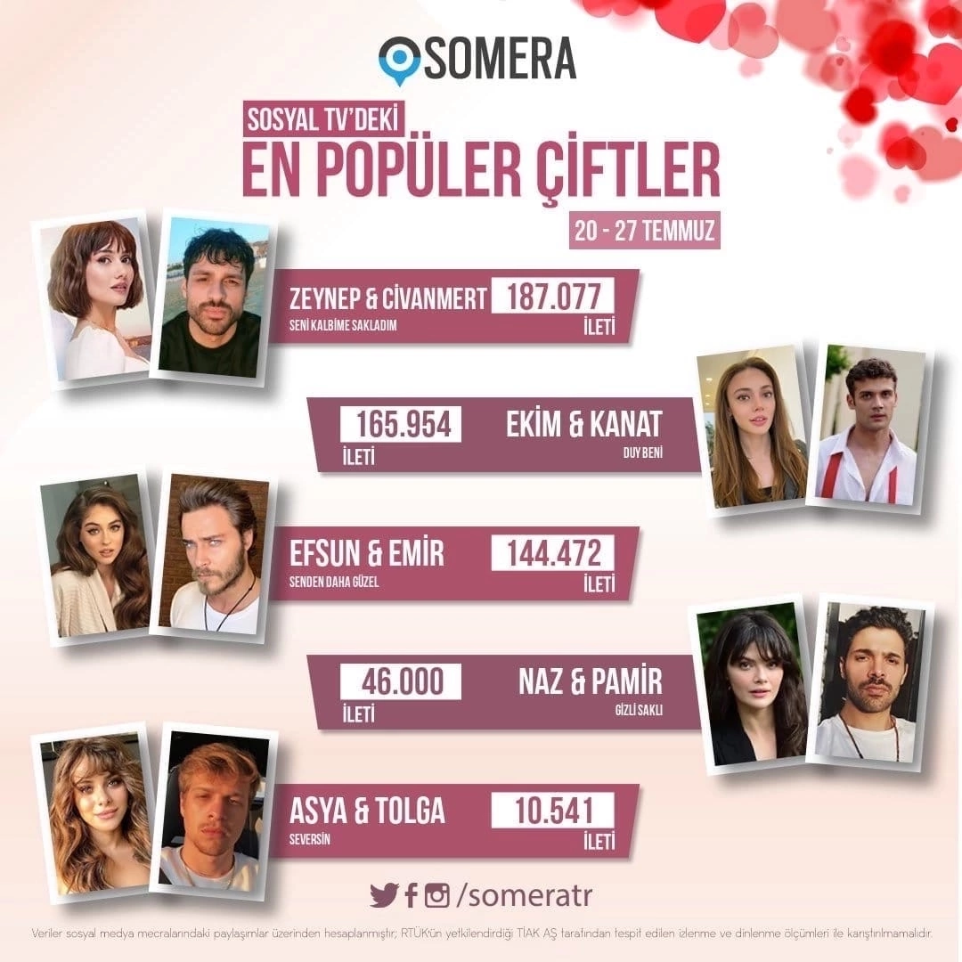 Чуть выше также пара из сериала, транслируемого по средам, Наз и Памир из «Под прикрытием». Пара также стала популярной, но в этом нет ничего удивительного. к сожалению, телевизионные рейтинги проекта заставили создателей принять решение о закрытии, то есть мы опять же наблюдаем, как расходятся телевизионный и социальный рейтинги.