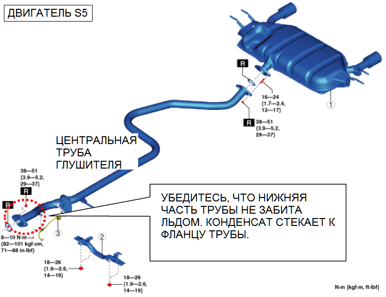 В некоторых автомобилях, например, после ночной стоянки при минусовых температурах окружающей среды может возникнуть проблема, заключающаяся в том, что двигатель не может быть запущен, несмотря на то, что коленчатый вал проворачивается стартером. Двигатель может запуститься и работать на неустойчивых оборотах холостого хода с зажиганием индикатора неисправности двигателя с любым из следующих кодов неисправности: P0300, P0301, P0302, P0303, P0304 (пропуски зажигания в цилиндрах). Двигатель запускается, когда наружная температура поднимется выше нуля и автомобиль будет оставлен в таких условиях на некоторое время. Эта проблема может быть вызвана увеличением сопротивления потоку выхлопных газов из-за скопления конденсированной воды и ее замерзания в средней выхлопной трубе системы выпуска – двигатель SKYACTIV-D 1.5 (S5) или в трубе с трехкомпонентным каталитическим нейтрализатором TWC – двигатель SKYACTIV-G 2.0 (PE). Описанное явление может иметь место, когда транспортное средство эксплуа