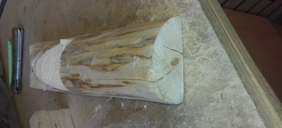 Закрепляю в своих деревянных тисках и делаю пару пропилов, облегчающий выборку древесины в области шейки.