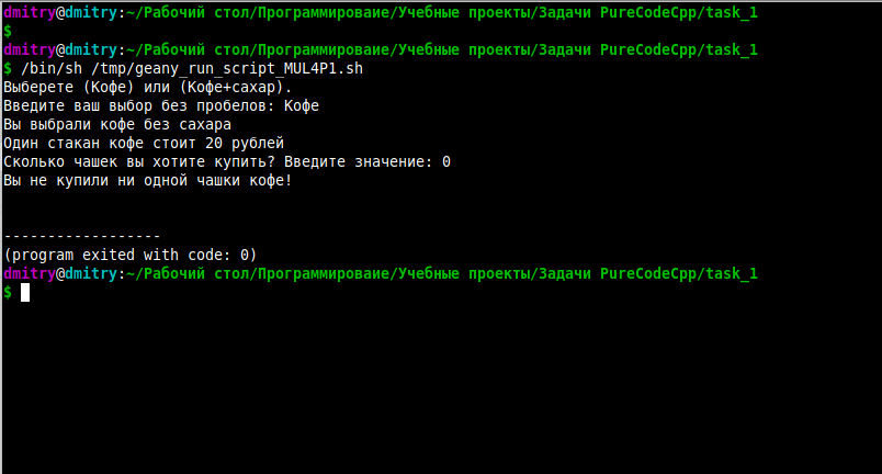 - Если пользователь напишет "Кофе", то он выберет кофе без сахара, и если программа просит его, сколько чашек кофе ему налить, и пользователь напишет 0, то программа выдаст следующее.