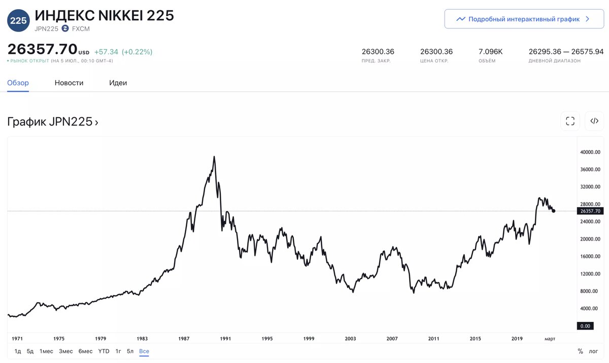 Nikkei 225 уже 33 года не обновлял исторический максимум, при этом 20 лет тренд был нисходящим.