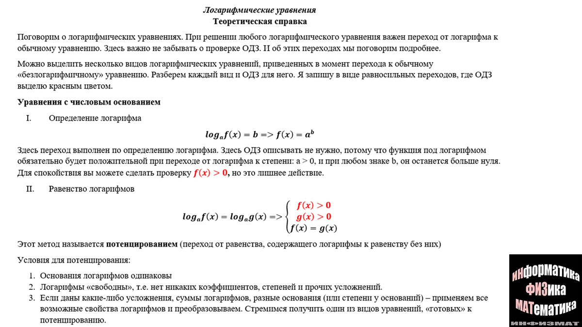 Логарифмические уравнения в №12 ЕГЭ математика профильный уровень. Подробный теоретический и практический разбор