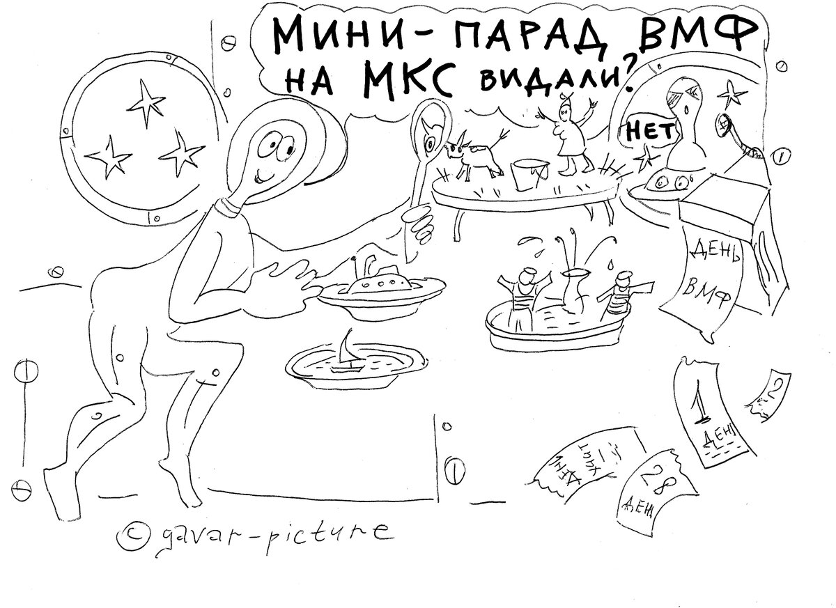 Цитаты: «Космонавт Роскосмоса Олег Артемьев зачитал поздравление в бескозырке». « В качестве единственного участника парада на МКС выступила фигурка, стилизованная под подлодку проекта 667БДРМ «Дельфин». А? Каково? Это же очень весело! Космонавт в бескозырке управляет на мини-параде малипусенькой подводной лодочкой!