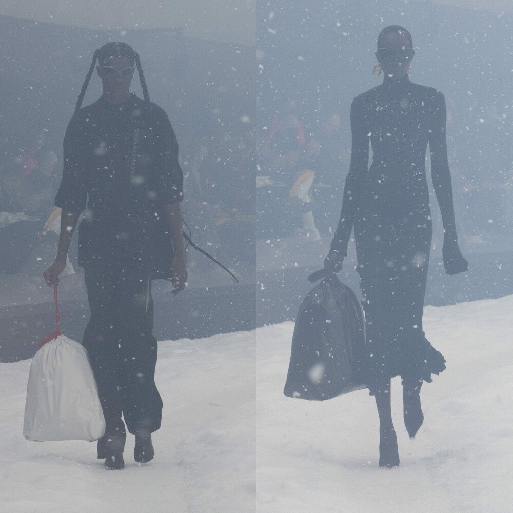 Впервые мусорные мешки появились в руках моделей Balenciaga во время показа осенне-зимней коллекции 2022 года. Им приходилось идти в метель, с трудом пробираясь по сугробам. Теперь один из главных аксессуаров шоу поступил в продажу. Сумки, не случайно получившие название Trash Pouch, доступны в черном, синем и белом цветах. «Я не мог упустить возможность сделать самый дорогой мешок для мусора в мире, потому что кто не любит модные скандалы?», — рассказал Демна Гвасалия WWD. Все же эта идея оказалась не оригинальной — В 2017 году испанский бренд BIIS выпустил серию кожаных сумок в стиле мусорных мешков. Но дороже, чем у Balenciaga, еще не было — сумки BIIS стоили 422 доллара, а Trash Pouch обойдется в 1790.