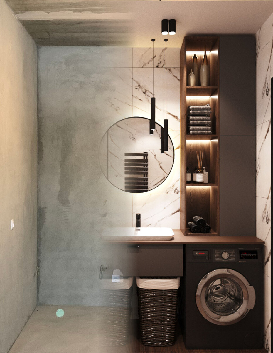 - Наиболее удачным сочетанием мрамор и песчаника будет текстура дерева, как в светлом исполнении, так и в темном. Добавлять третью текстуру в интерьер небольшого помещения не стоит, так как мы можем визуально перегрузить интерьер. Согласитесь, все достаточно просто.