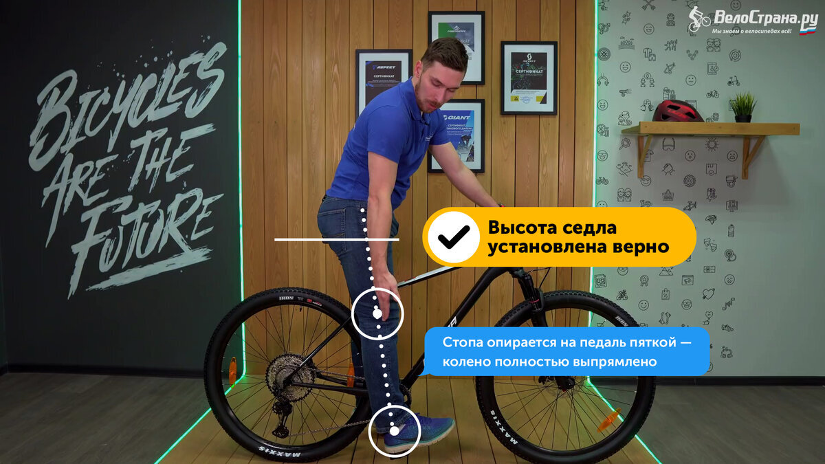 Если нога полностью выпрямлена — седло стоит правильно по высоте. При этом в естественном положении ступни при вращении педалей нога будет оставаться слегка согнута в колене.