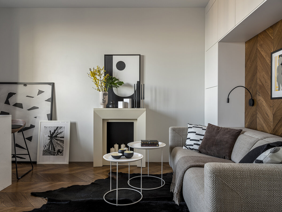 Эта квартира в Санкт-Петербурге принадлежит архитектору Алексею Иванову, основателю студии дизайна Geometrium. «Для себя я хотел создать светлый современный интерьер, наполненный воздухом, белый лист, который можно заполнить произведениями современного искусства», — рассказывает он. До начала работ квартира имела в плане маленькую зону кухни и большую спальню. «В современном мире все должно быть наоборот, — говорит Алексей. — Спальня только для сна и объединенная кухня-гостиная-столовая для комфортной жизни. Мы поменяли местами эти помещения: кухня осталась в мокрой зоне, но теперь ориентирована в сторону комнаты». В ванной комнате керамогранит имитирует мрамор и дерево, а шестиугольная плитка напоминает о классических интерьерах Петербурга — такая форма часто использовалась в начале XX века. В спальне атмосферу создает зона отдыха у окна, где можно остаться с книгой, наблюдая за меняющейся в течение дня панорамой города. Белый цвет стен помог визуально увеличить пространство, а чтобы