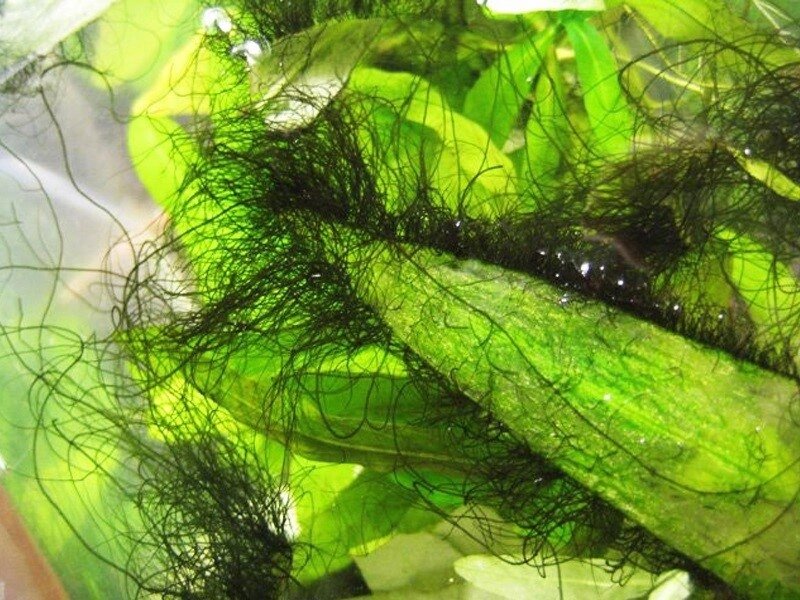 Водоросли — низшие одноклеточные и многоклеточные водные растения, попадающие в аквариум с водой, грунтом, рыбами, новыми растениями и даже из воздуха. Полностью избавиться от водорослей невозможно, но в наших силах не позволить им чрезмерно размножаться. Одни виды только портят внешний вид аквариума налетом или неопрятной бахромой, другие могут угрожать здоровью его обитателей. Часто размножение водорослей служит признаком того, что аквариум перенаселен рыбами. И наоборот, чем больше в нем сильных быстрорастущих растений, тем труднее водорослям отвоевать позиции в борьбе за жизнь. Сине-зеленые водоросли: Цианобактерии, или сине-зеленые водоросли, выделяют токсины, опасные для рыб. Эти микроорганизмы прекрасно себя чувствуют в аквариумах с избытком органических веществ в воде и со слишком высоким значением pH, покрывают стекла, камни, коряги слизистым налетом с очень неприятным запахом. При высокой температуре и сильном освещении они быстро размножаются, вода становится непрозрач