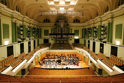 Между тем, в столице Ирландии имеется огромное, массивное и величественное здание серого камня под названием Национальный концертный зал. Внутри зал раскрашен в различные весёленькие оттенки зелёного — любимого цвета ирландцев, над его сценой нависает изящный тёмного дерева орган, а акустика в зале — просто изумительная.