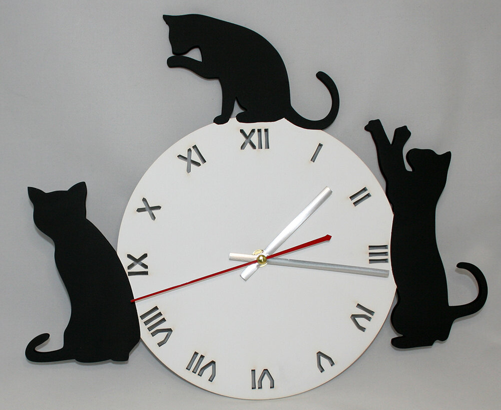 Часы из дерева настенные — продолжение уже популярных часов из дерева кошки, в черном и белом цветах. Заказать настенные часы с доставкой Настенные часы — один из атрибутов стиля помещения, которые должны его дополнять. Именно поэтому к выбору настенных часов нужно подходить тщательно. Не так быстро, как хотелось, но мы стараемся пополнять наш каталог настенных часов новыми товарами. Мы либо сами ищем новые дизайны, или же нас вдохновляют наши покупатели. Например, они не редко дополняют купленные у нас часы своими, оригинальными решениями. Например, раскрашивая их дополнительными цветами. Именно такое искусство одного из наших покупателей, сподвигло нас на изготовление первых, двухцветных часов. Производство настенных часов Изготовление настенных часов осуществляется на станках для лазерной резки дерева. Именно это оборудование позволяет вырезать точно по макету, который был создан. Макет — электронная версия часов, нарисованная в специальной графической программе. Какими будут будущ