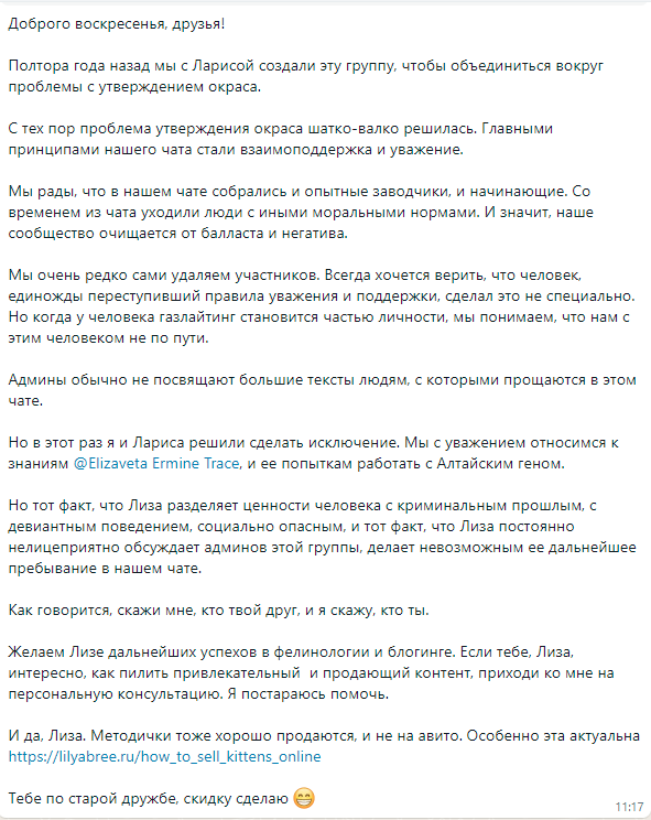 В какой-то момент Ольга Харламова оказалась в тюрьме - за что и почему, я не вникала, поскольку к ее заводческой деятельности это не имело отношения. Выйдя на свободу, Ольга решила вернуться в фелинологию - зарегистрировала новый питомник, засветилась в профессиональных чатах, оживила аккаунты в соцсетях и возобновила общение с заводчиками. Однако с некоторыми из них, в том числе с Лилей Бри и Ларисой Русяевой, что-то пошло не так. И если в первом случае говорить особо не о чем (Лиля новичок и с Ольгой пересеклась впервые), то во втором все гораздо интереснее - и вряд ли тому виной обычный снобизм и желание дистанцироваться от бывшего заключенного, кем бы он ни был.