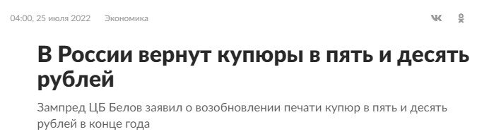 Не так давно в СМИ была замечена одна любопытная новость: Центробанк планирует возобновить печть купюр номиналом в 5 и 10 рублей. Это озвучил зампред ЦБ Сергей Белов, который так же заявил, что новые купюры будут напечатаны уже к концу 2022 года. Как выглядят купюры 5 рублей - многие уже и не помнят (а кто-то даже никогда их не видел), про купюры 10 рублей тоже уже все начали подзабывать, и тут такая новость. Как это часто бывает, россияне сразу заподозрили что-то неладное: а не деноминация ли это готовится? Сразу разочарую сторонников таких теорий. При деноминации ЦБ печатал бы купюры нового образца, которые должны были бы отличаться от старых, поскольку имели бы уже другую ценность. Но здесь речь идет именно о возобновлении печати купюр старого образца. Так что, нет, не деноминация. А что тогда? Здесь можно только предполагать, поскольку точного объяснения в ЦБ не дали. Или пока не дали. Я полагаю, что здесь банально идет речь или о финансовой или о технической стороне вопроса. Напри